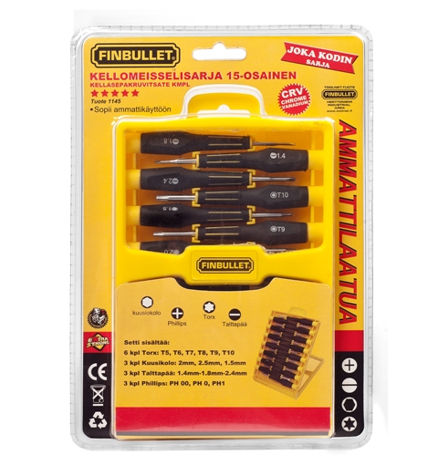 Finbullet Kellomeisselisarja 15-os Tuotekoodi: 1145 Finbullet 15-osainen Kellomeisselisarja. Soveltuu ammattikäyttöön. Terät chrome vanadium sisältää: Ristipää 00 x 25, Ristipää 0 x25... Lue lisää