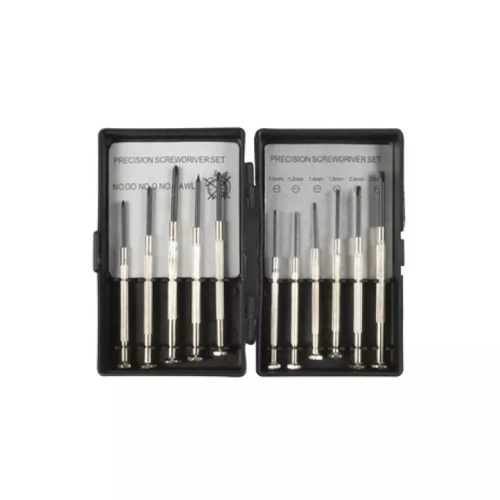 11 – osainen ruuvimeisselisarja kätevässä rasiassa jota on helppo kuljettaa mukana. Sisältö: 5 x Phillips: PH0000 PH000 PH00 PH0 PH1 5 x talttameisseli: 1.0 mm 1.2 mm 1.4 mm 1.8 mm 2.4 mm 3.0... Lue lisää