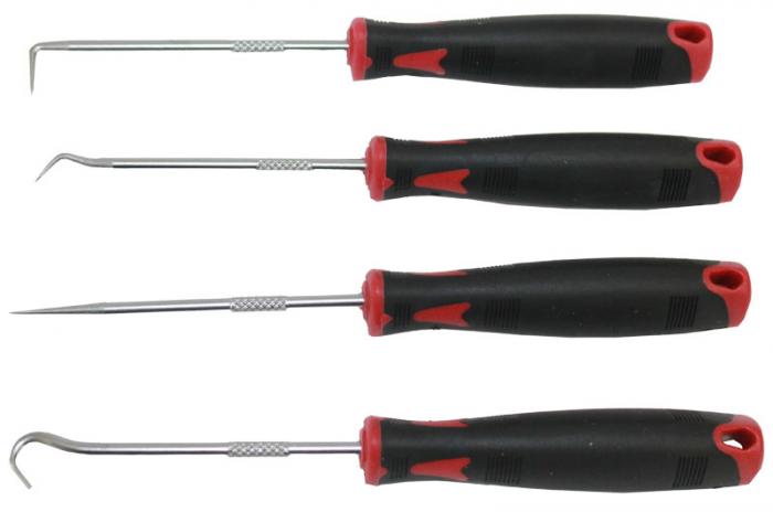 Lajittelu- ja piirtokoukkusarja 4-os. Johtojen erotteluun, pienten sulakkeiden, o-renkaiden ja prikkojen ym. Irrottamiseen ja asennukseen, 1 x suora, 1 x kaarikoukku, 1 x 45o kulmakoukku, 1 x 90o kulmakoukku, Kokonaispituus 170 mm