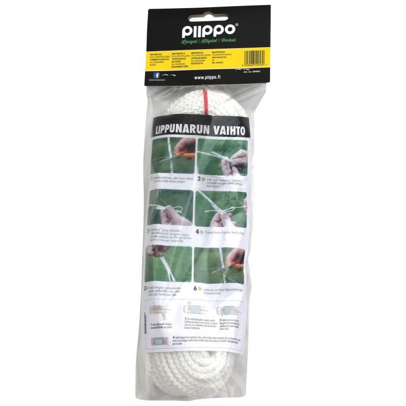 Lippunarun erikoispalmikointi ja sisus varmistavat sopivan jäykkyyden sekä venymättömyyden. Pakkauksen mukana tulevat sekä lippulukot että vaihto-ohjeet. Piippo-lippunarussa on erinomainen sään, ja UV:n kesto. Köysi on valmistettu 5,5mm x 25m polypropeenimultifilamentista, ja sen murtolujuus on 300kg.