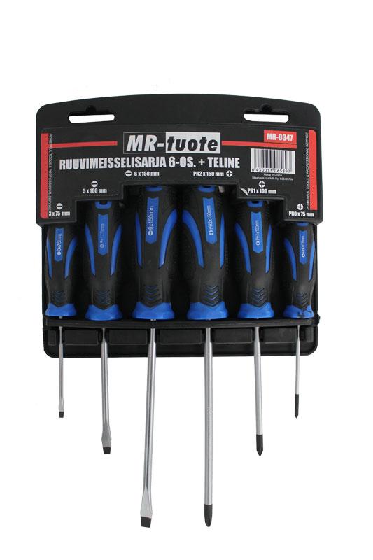 RUUVIMEISSELISARJA + TELINE Sarjaan sisältyy kätevä teline meisseleille! Kuusi osainen sarja - päät: 3 x 75mm, 5 x 100mm ja 6 x 150mm + päät: PH0 x 75mm, PH1 x 100mm ja PH2 x 150mm
