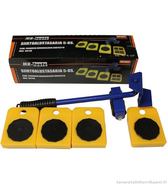 MR-Tuote 5-osainen siirtoalustasarja • 4 kpl siirtoalustoja • Alustan koko 104 × 79 × 32,4 mm • Alustassa 8 kpl renkaita: Ø 27 × 12,4 mm • Alustan materiaali ABS muovi • Renkaiden materiaali Polystyreeni (PS) • 1 kpl vipuvarsi • Koko 345 × 95 × 100 mm • Renkaita 4 kpl Ø 37,1 × 16,8 mm • Vivun materiaali Q235A teräs • Renkaiden materiaali Polystyreeni (PS) • Kapasiteetti 150 kg • Huonekalujen ja tavaroiden siirtelyyn sisätiloissa