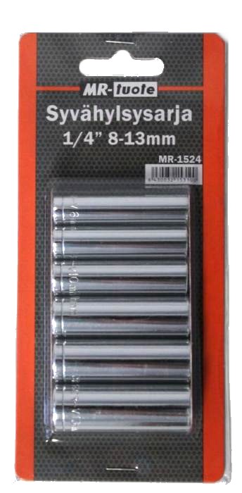SYVÄHYLSYSARJA PITKÄ 1/4" 8-13mm 6kpl Kuusiosainen sarja sisältää erikokoisia syvähylsyjä. Pitkä malli, Koot 8, 9, 10, 11, 12 ja 13mm 1/4"Pakkauksessa 6kpl