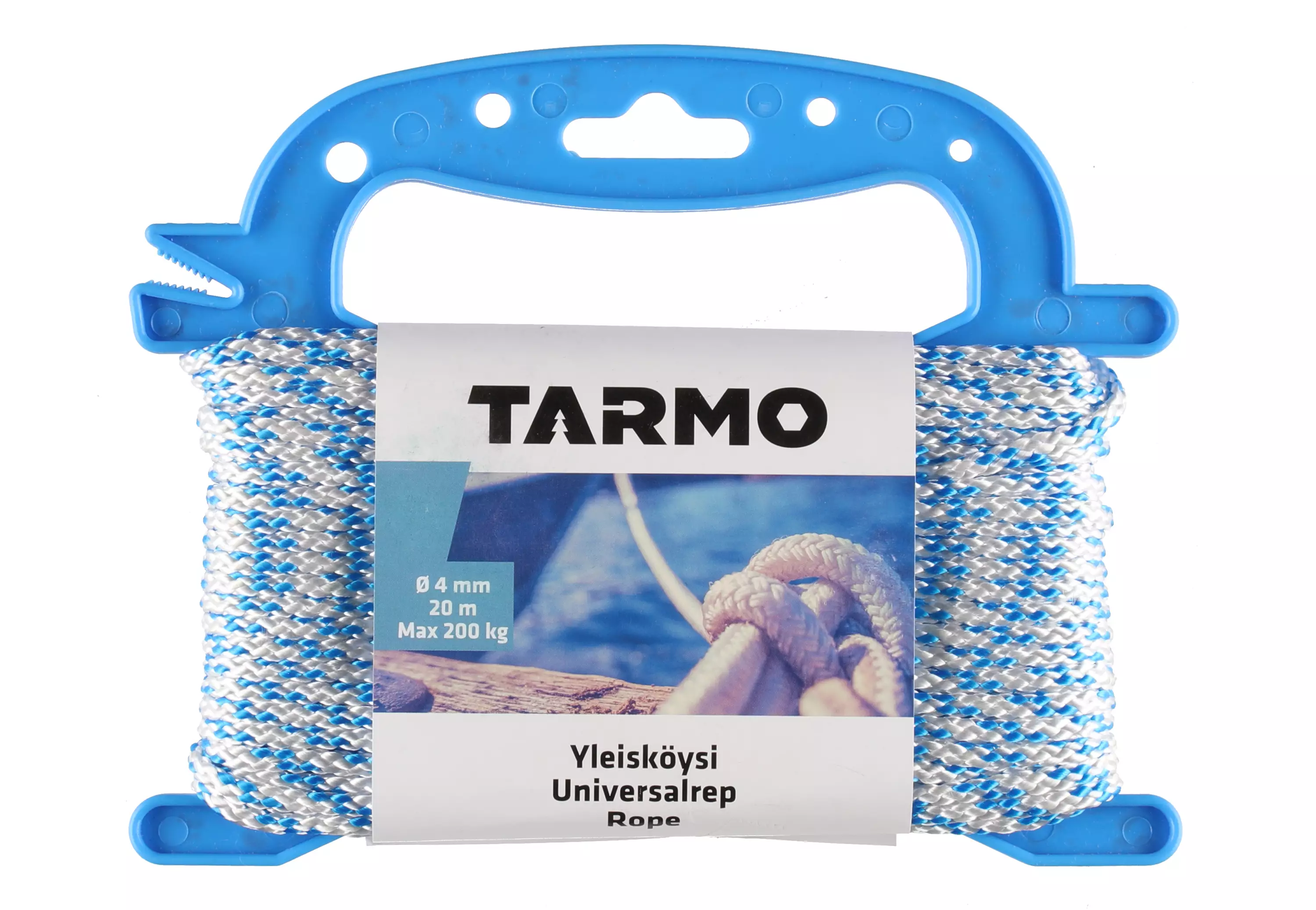 Valkoinen polyesteriköysi sinisillä merkkilangoilla. UV-suojattu. Kelluva. Murtolujuus 200 kg. Venyvyys 26 %.
