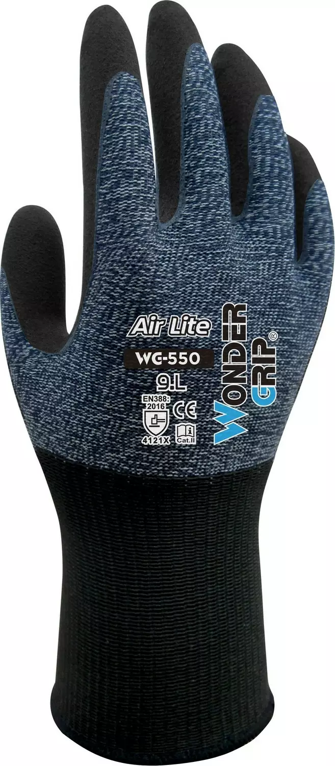 WG-550 Air Lite -käsineessä on yksinkertainen nitriilipinnoite 15-g-neuletiheyden nailon- ja polyesterivuori. WG-550 Air Lite tarjoaa mainion notkeuden, käden liikkeet ovat helpompia ja näin näppäryys paranee tehtäessä tarkkuustöitä. Parannettu pinnoitus ja vuori on suunniteltu tarjoamaan parasta hengittävyyttä ja tekemään käsineestä mukavan pitkässä käytössä.