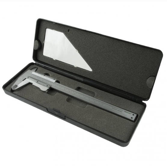 Liukulukollinen 150mm pitkä työntömitta ikkunallisessa ja pehmustetussa muovikotelossa.