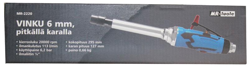 KARAHIOMAKONE 127mm PITKÄ KARA Karalaikkahiomakoneella hiot kaarevat ja vaikeat muodot, kuten pienet kulmat, vaivattomasti ja helposti. Tämä laadukas, hyvin vääntävä paineilmavinku sopii niin harrastelijoille kuin ammattikäyttöönkin. Suorahiomakoneessa on pitkä 127mm kara, 6mm istukka ja kierrosluku jopa 20000 rpm. Kierrosluku 20 000rpm, Ilmankulutus 113 l/min, Käyttöpaine 6,2bar, Ilmaliitin ¼", Kokopituus 295mm, Karan pituus 127mm, Paino 0,66kg, CE-hyväksytty