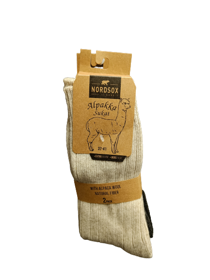 Lämpimät alpakanvillaa sisältävät sukat ulkoilma-aktiviteetteihin. Sukissa tyylikkäät värit beige ja tummanharmaa. Materiaali 45% alpakkavillaa, 22% polyesteriä, 17% viskoosia, 15% polyamidia ja 1% elastaania.