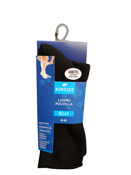 Diabetessukat eivät kiristä nilkoista, eivätkä täten häiritse verenkiertoa. Sukissa on liukumaton pohja ja materiaali on pehmeä ja hengittävä. Koko 43-45. Musta väri