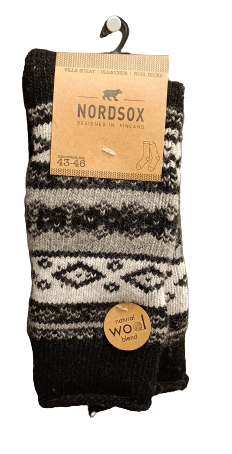 Mustaharmaat villasukat hienolla kuviolla. Koko 43-46. Materiaali 60% villa, 20% akryyli ja 20% polyesteri.