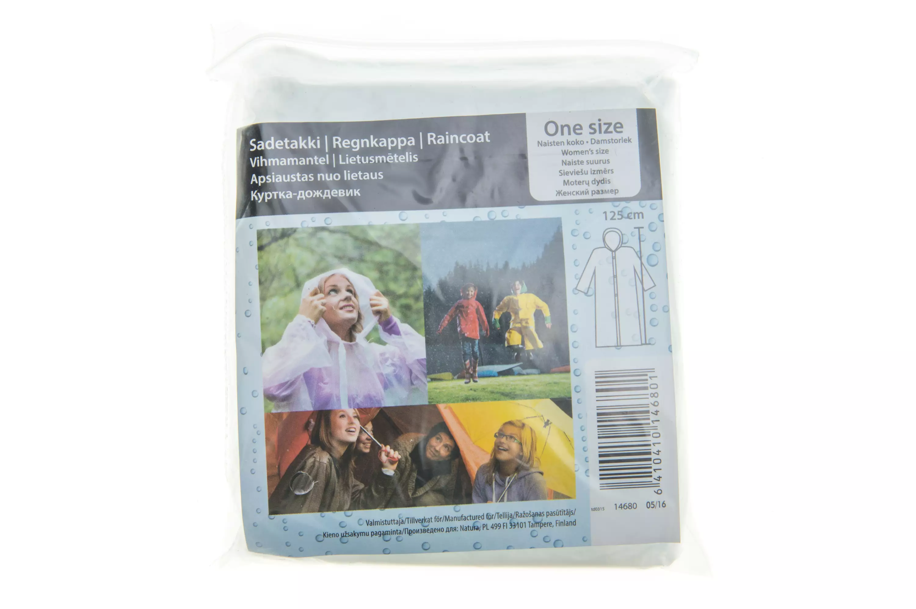 Edestä napitettava hupullinen kertakäyttöinen sadetakki naisille.
