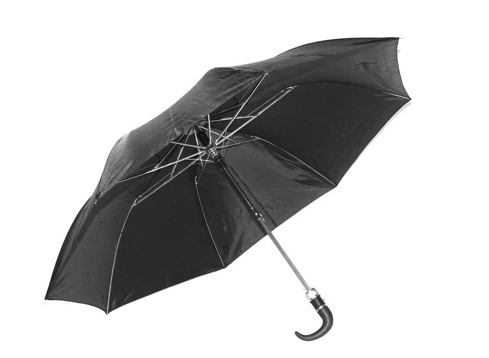 Klassinen musta sateenvarjo automaattisella avausmekanismilla. Halkaisija 93 cm. Pituus suljettuna n.40 cm.