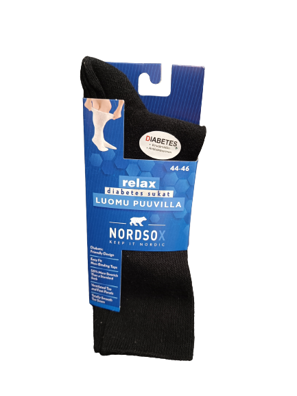 Kiristämättömät diabetessukat koossa 44-46. 80% luomupuuvillaa, 18% polyamidia, 2% elastaania. Valmistusmaa Turkki