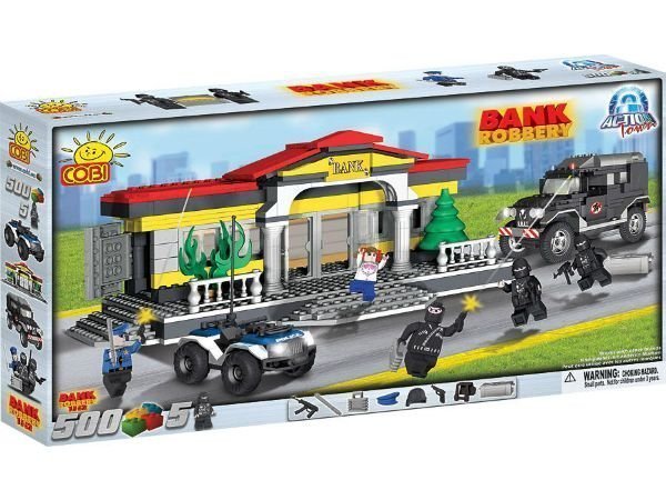 Cobi Action town -sarjaan kuuluva pankkiryöstö-rakennuspalikkasetti. Sisältää muun muassa omat poliisijoukot ja ryöstettävän pankkirakennuksen. Cobi on suosittu rakennuspalikkasarja ja setit sopivat yhteen muiden Cobi-lelusettien kanssa.