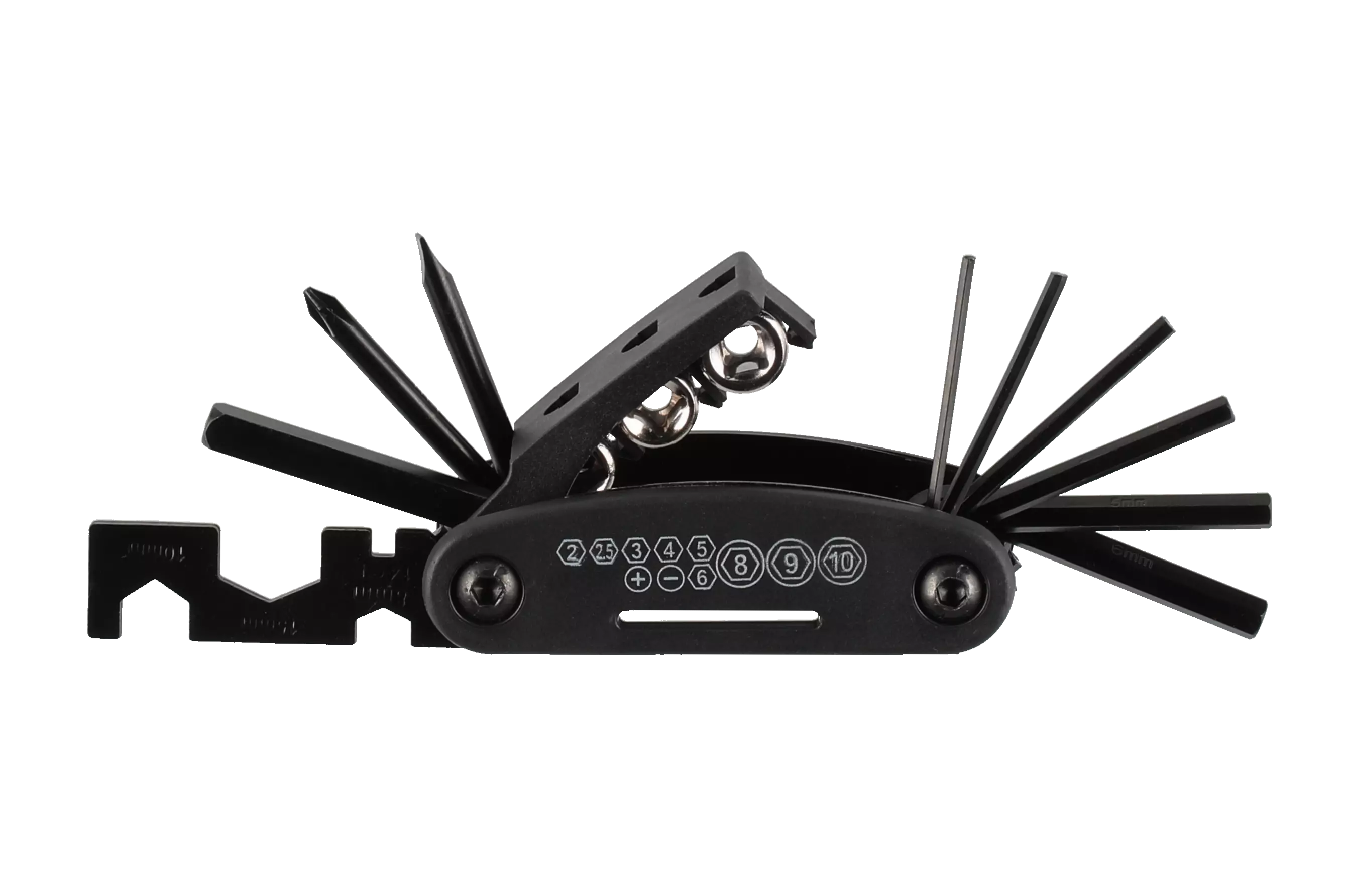 Erinomainen varuste ahkeralle pyöräilijälle. Monitoimityökalu sisältää: talttapää ruuvimeisseli, ristipää ruuvimeisseli, kuusiokoloavain: 2/2,5/3/4/5/6 mm, kiintoavain 8 mm, 10 mm, 15 mm, pinna-avain (koko 14GE), jatkovarsi, hylsyvain 8 mm, 9 mm, 10 mm.