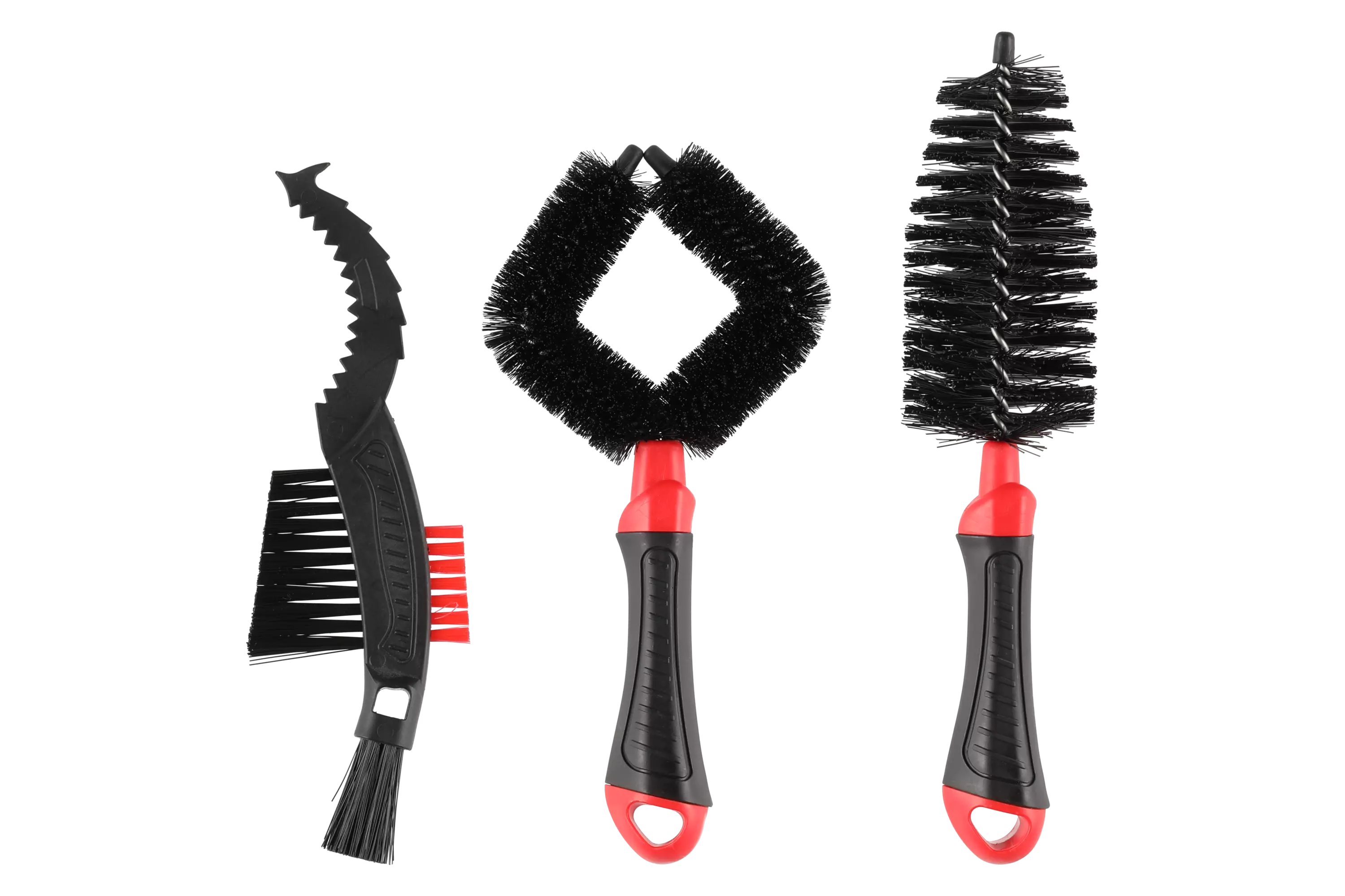 Pyörän säännöllinen puhdistaminen on tärkeää, jotta pyörä kestää ja palvelee pitkään. Pyörä kannattaa pestä aina huoltojen yhteydessä ja kurakelien jälkeen, jotta lika ei jämähdä kiinni runkoon, ketjuihin ja rattaisiin. Setti sisältää kolme erilaista harjaa: Harja renkaiden puhdistamiseen 22 cm, harja vaihteiston puhdistamiseen 23 cm ja harja muiden osien puhdistamiseen 28 cm.