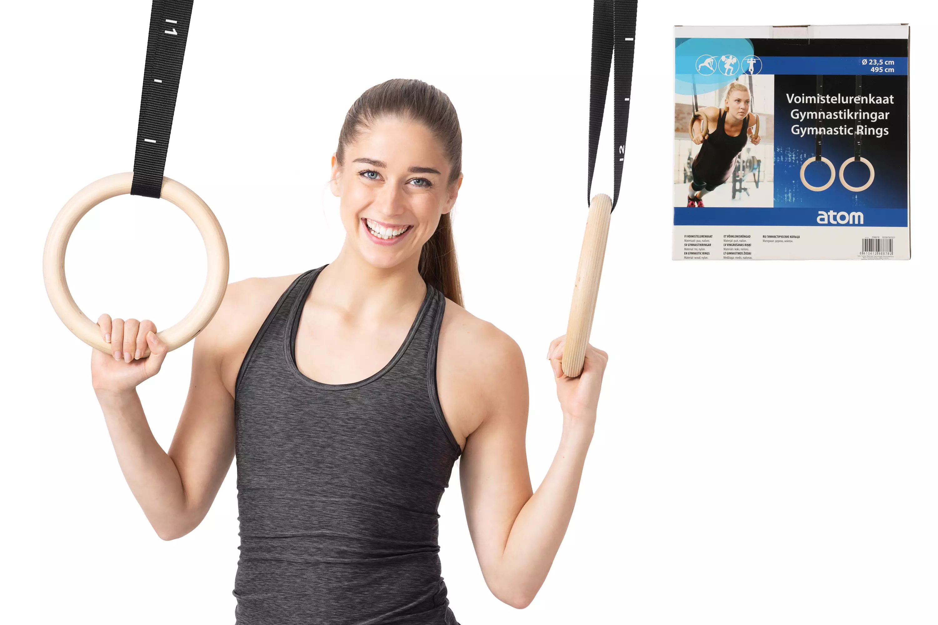 Puiset renkaat soveltuvat useimpien akrobatia- ja voimisteluliikkeiden harjoittelemiseen. Renkaiden avulla voit aloittaa harjoittelun kotona ja parantaa tekniikkaasi. Renkaat eivät ole vain voimistelijoille, myös kehonrakentajat voivat hyötyä harjoittelusta renkaiden parissa. Voimistelurenkaiden avulla voit tehdä erilaisia ylävartalon harjoituksia, kuten rengasnousuja, vetoja, lihasnousuja, rengassoutuja ja paljon muuta. Renkaat on valmistettu kestävästä puusta. Renkaan halkaisija 23,5 cm. Remmin pituus 495 cm. Enimmäiskantavuus 300 kg.