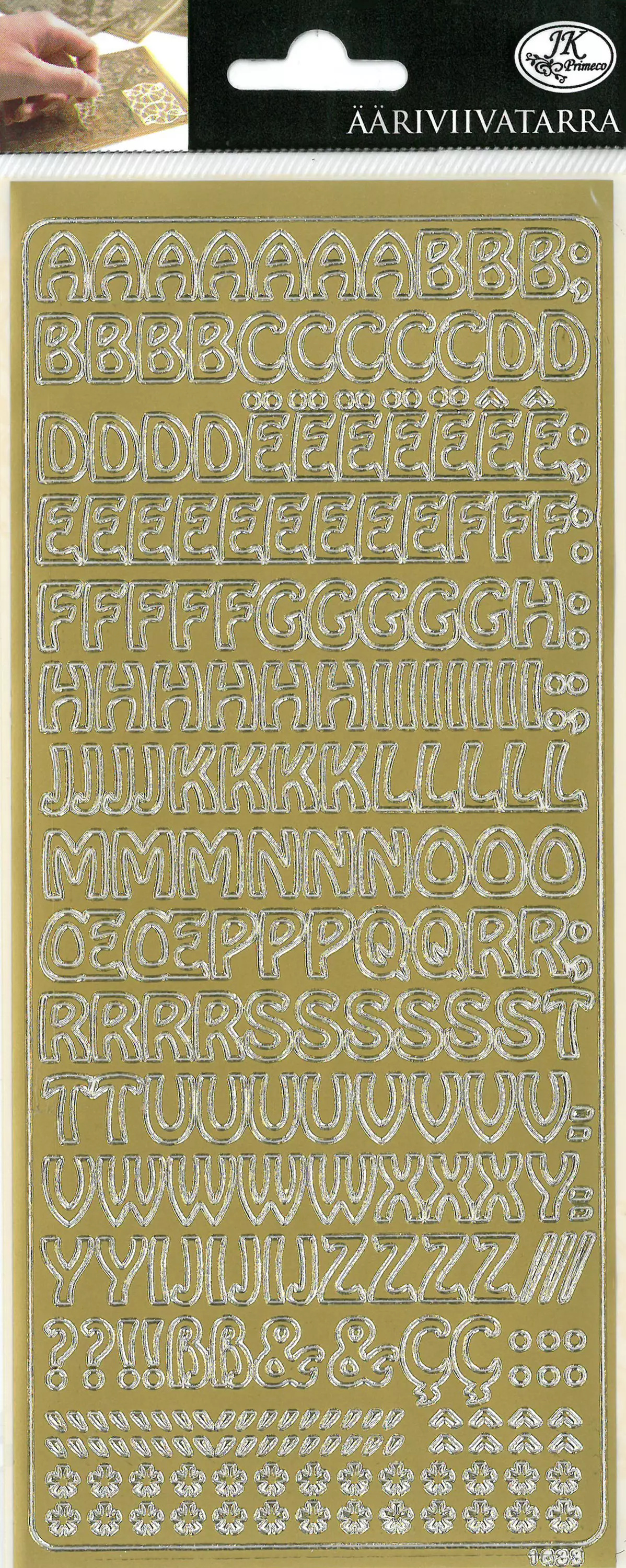 Ääriviivatarra Kirjaimet kulta on monikäyttöinen ääriviivatarra-arkki (outline tarrat, kirjainarrat, askartelutarrat), joka soveltuu erinomaisesti tekstien ja nimien muodostamiseen askarteluprojekteissa. Kultaiset kirjaimet tuovat näyttävyyttä ja selkeyttä erilaisiin toteutuksiin.