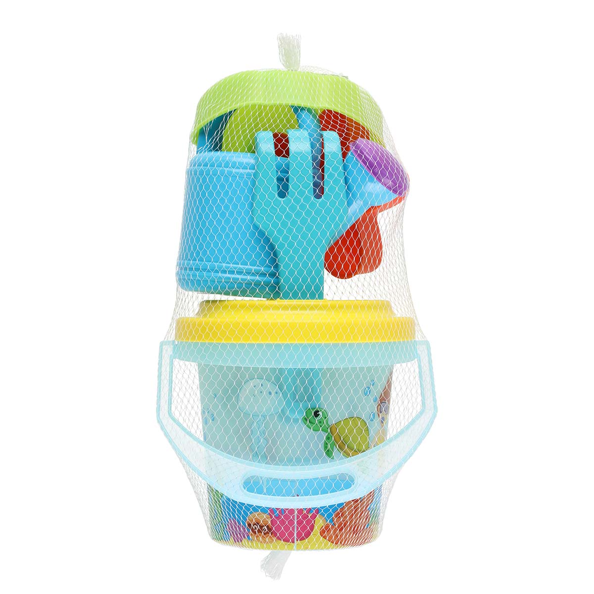 Värikäs hiekkalelusetti sisältää kannellisen ämpärin, lapion, haravan, kastelukannun ja kaksi erilaista hiekkamuottia. Ikäsuositus 1+.