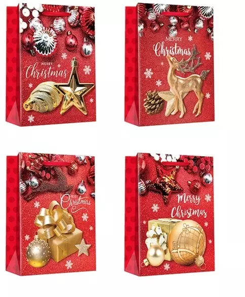 Tyylikäs joululahjakassi tekee lahjan antamisesta entistä juhlavampaa. Punainen kassi on koristeltu jouluisilla kuvioilla, kuten koristepalloilla, tähdillä, lahjapaketeilla ja porolla sekä tekstillä Merry Christmas. Näyttävä ja lämminhenkinen ulkoasu sopii täydellisesti joululahjojen pakkaamiseen.