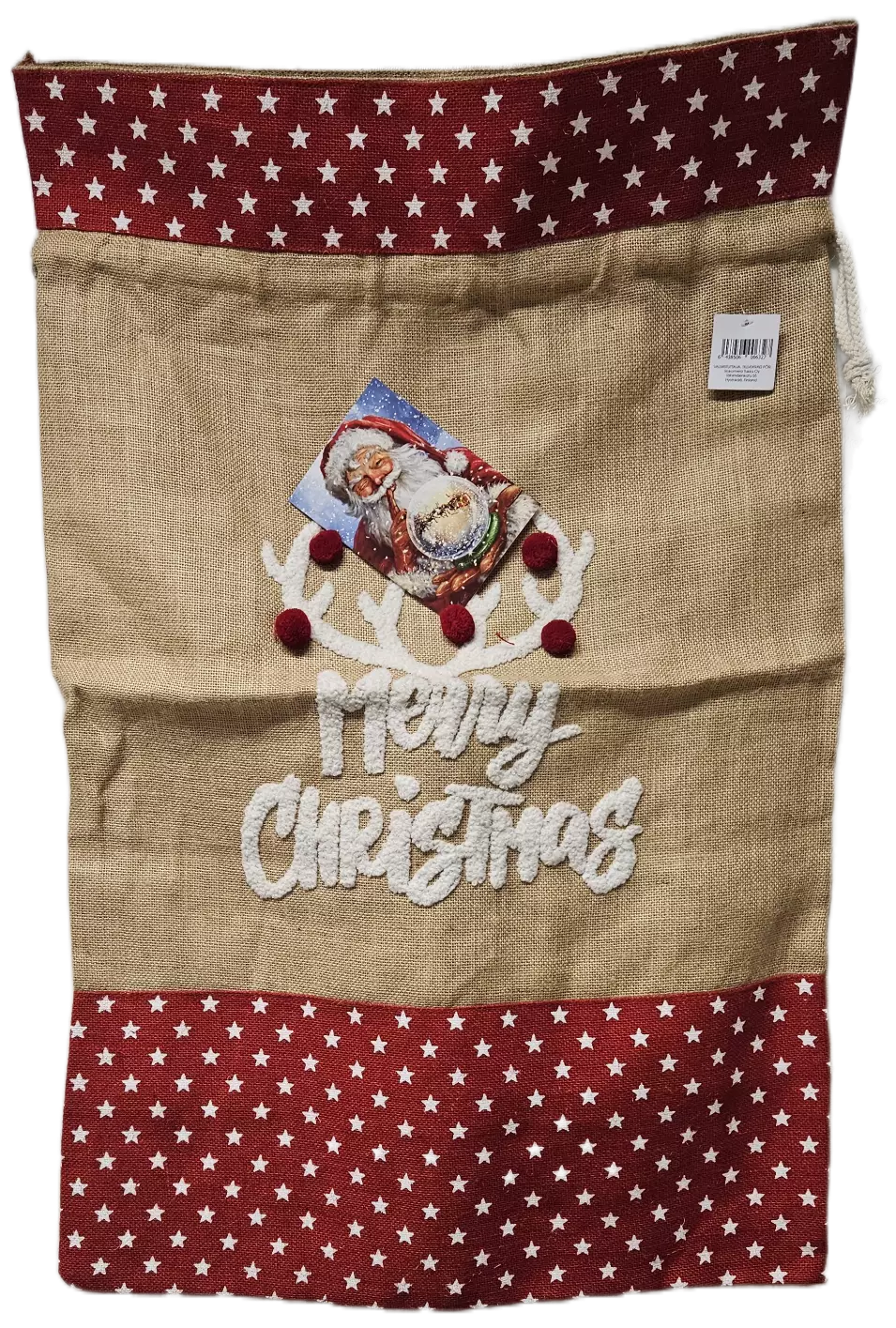 Säkin etuosassa on tyylikäs Merry Christmas -teksti sekä somisteena punaisia tupsuja ja poronsarvikuvio – kokonaisuus henkii lämmintä, perinteistä joulutunnelmaa. Ylä- ja alaosaa koristavat punaiset kangaskaistaleet valkoisin tähtikuviolla, jotka tuovat säkkiin iloisen ja jouluisen ilmeen.