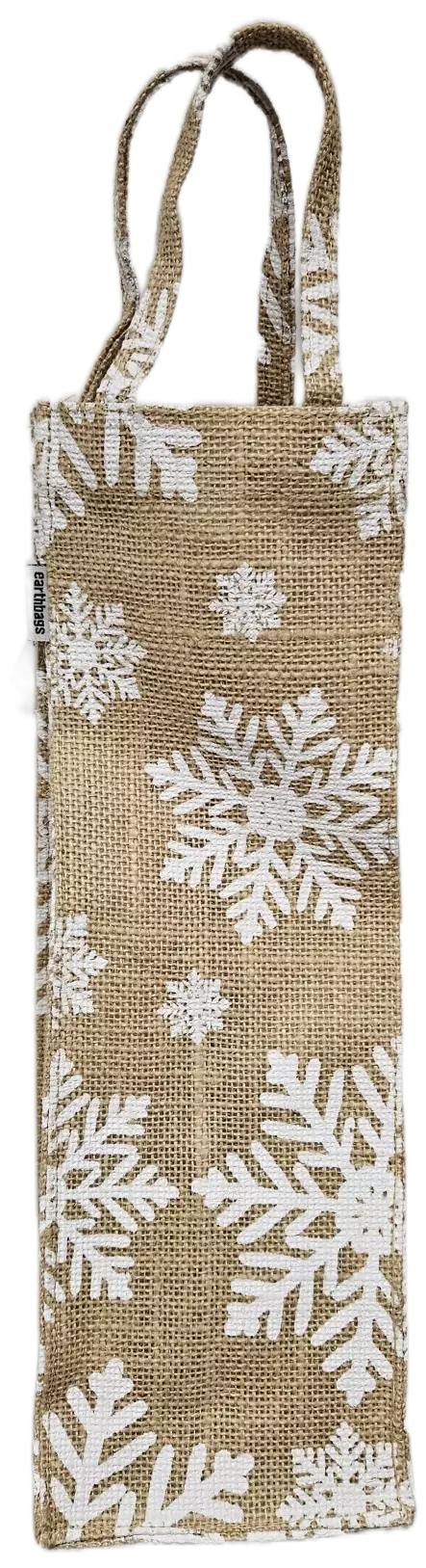 Tee pullolahjasta näyttävä ja vastuullinen tällä kauniilla juuttikankaisella pullokassilla! Luonnollinen juutin sävy ja elegantit valkoiset lumihiutalekuvioinnit tuovat talvista tunnelmaa ja tekevät lahjasta heti juhlavamman.