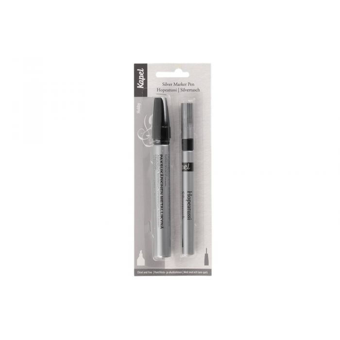 Pakkauksessa sekä ohut- että viistokärkinen vedenpitävä hopeatussi. Hopeatussi käy kaikenlaiseen askarteluun ja koristeluun.