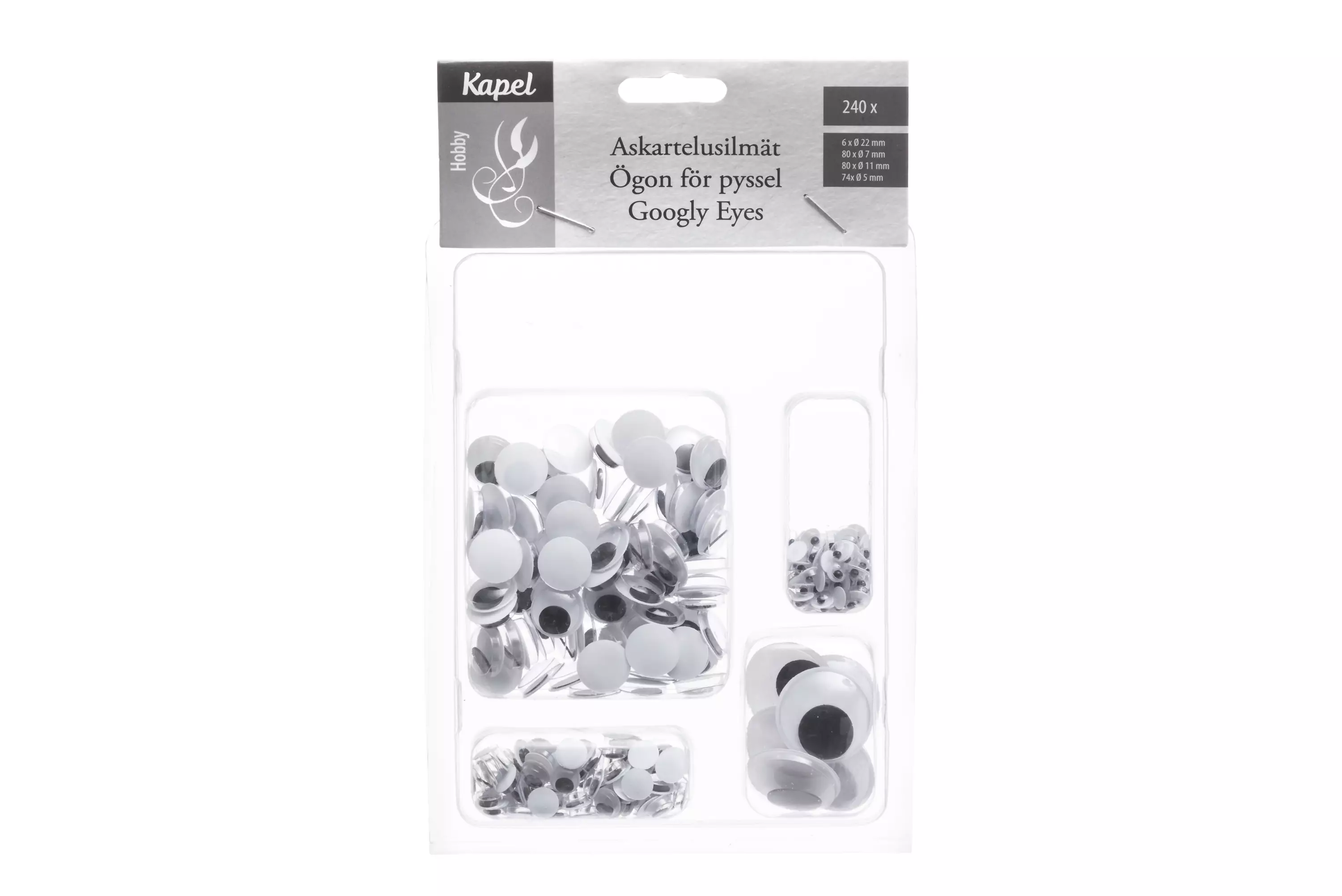 Pakkauksessa neljää eri kokoa liikkuvia silmiä askarteluun. Täydellisiä limojen koristeluun ja kaikenlaisiin askarteluprojekteihin. Liikkuvat silmät antavat ilmettä itsetehdyille nukeille, maalatuille kiville, valokuviin, piirroksiin, melkein ihan mihin vain. Pakkaus sisältää: 6 kpl 22 mm, 80 kpl 11 mm, 80 kpl 7 mm 74 kpl 5 mm.