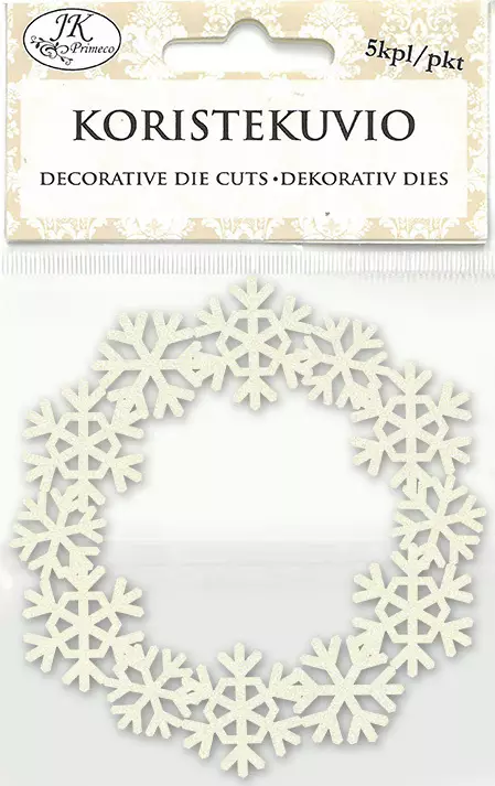 Koristekuvio askarteluun ja koristeluun. Kuvioissa glitterpinta. Pakkauksessa 5 kuviota, yhden kuvion koko n. 8 x 8cm. Materiaali kartonki, vahvuus 250g. Tuotteen suunnittelija J.K. Primeco Oy.... Lue lisää