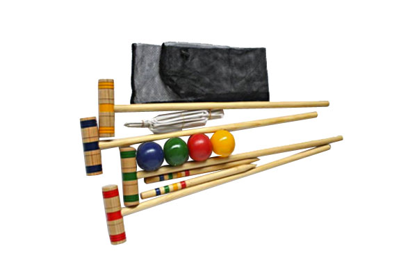 Neljän hengen krokettipeli. Sisältää mailat, pallot, lopetus/aloitustikut sekä portit.