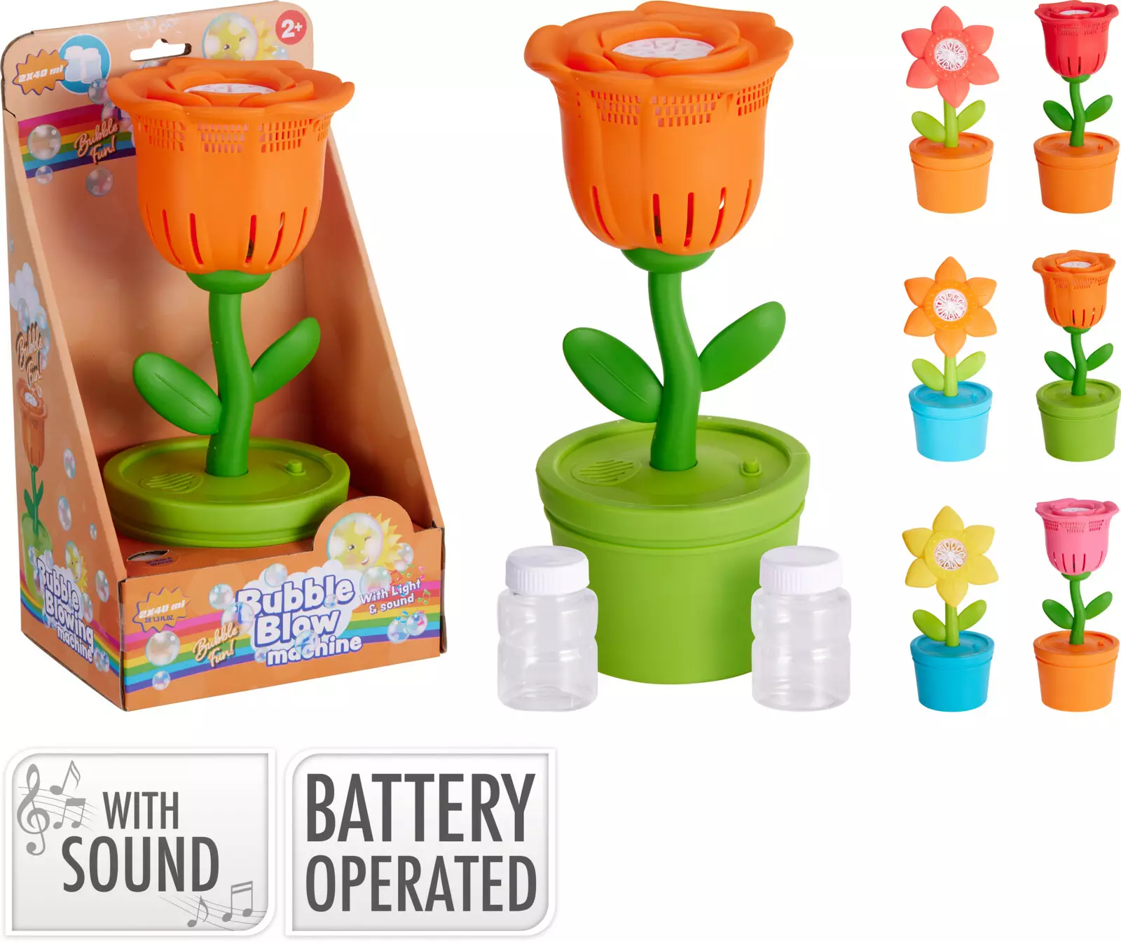 Hauska kukkamuotoinen saippuakuplakone, joka tuottaa runsaasti kuplia ja ilahduttaa valolla sekä äänillä. Mukana valmiiksi kuplanestettä, joten leikit voivat alkaa heti.