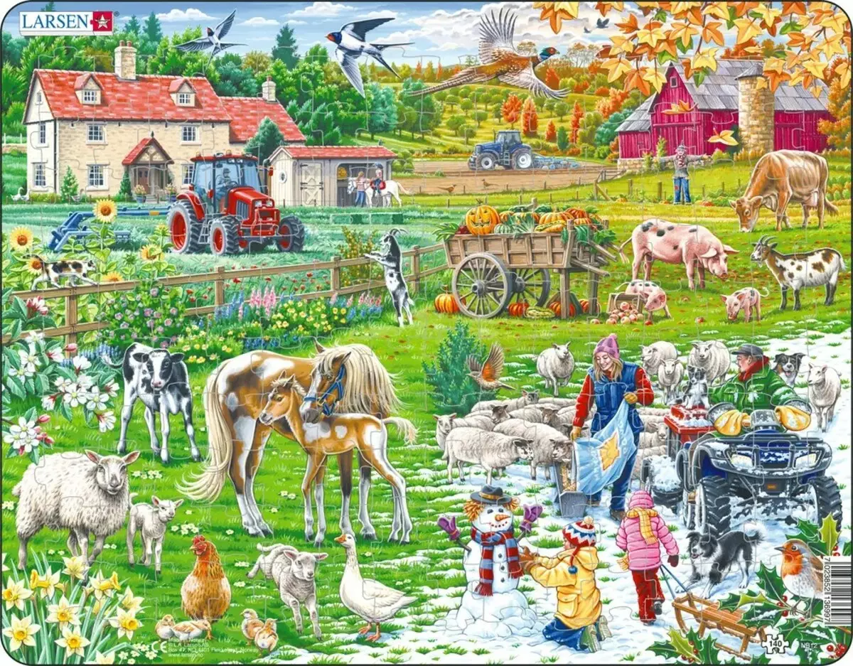 Maxi 28,5 x 36,5 cm. Tässä maatilapalapelissä on 140 palaa ja näet maatilan jokaisessa neljässä eri vuodenajassa. Vasemmalla ylhäällä on ihana kesäpäivä jota seuraavat kauniit syksyn värit, alhaalla luminen talvi ja kevät, jolloin eläinvauvat syntyvät ja narsissit kukkivat.