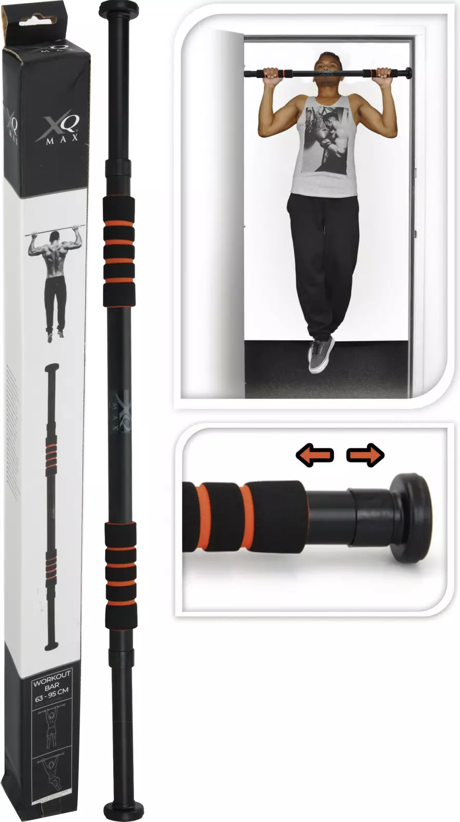 Valmistettu kestävästä teräksestä ja varustettu pehmeillä vaahtomuovikahvoilla, tanko tarjoaa tukevan otteen ja miellyttävän käyttökokemuksen. Säädettävä leveys mahdollistaa helpon asennuksen eri kokoisiin oviaukkoihin.