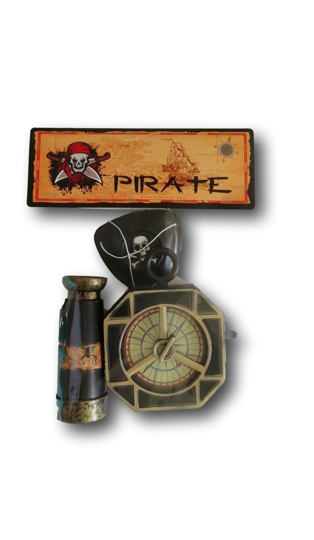 Merirosvon välttämättömimmät tarvikkeet! Teleskooppi kaukoputki, silmälappu sekä kompassi osoittamaan suunnan reitille! Ikäsuositus 3+ vuotta. Tuotteen mittatiedot: 16 x 21 x 4 cm - 0,071 kg