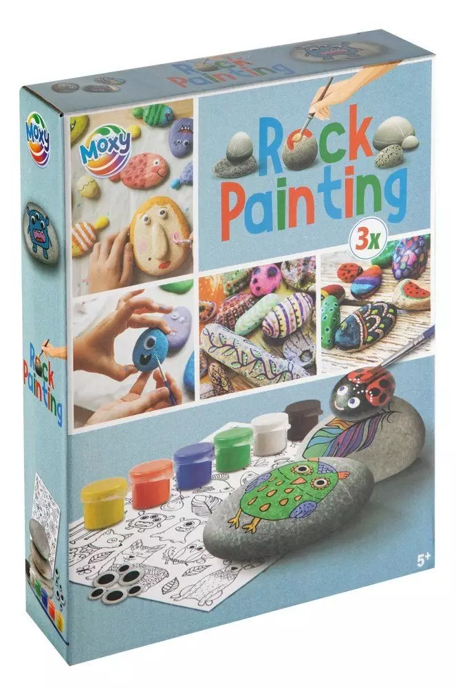 Tuo luovuus esiin Moxy Kivien maalaussetillä! Tämä hauska askartelupakkaus sisältää kaiken, mitä tarvitset uniikkien kivitaideteosten luomiseen: