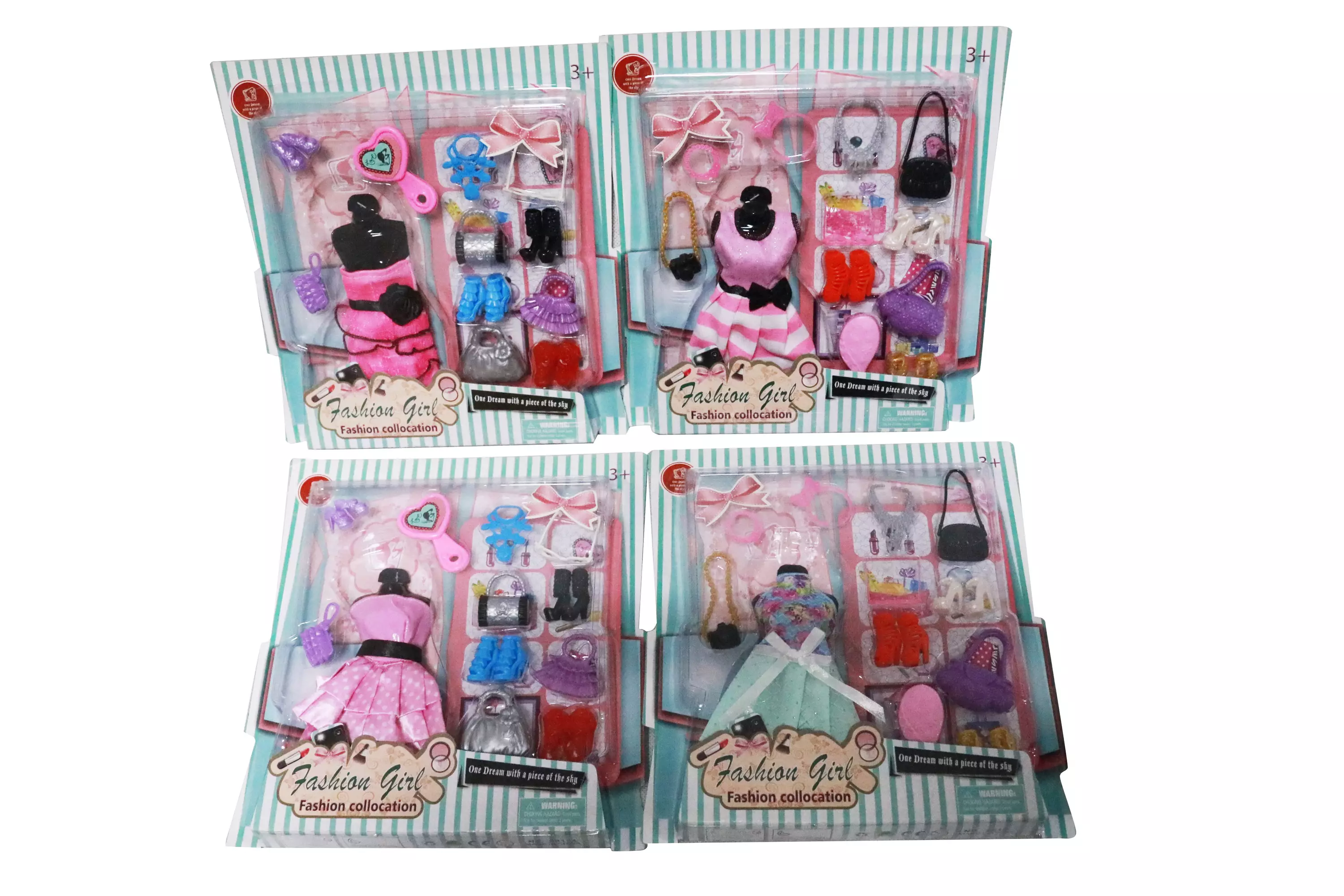 Pakkauksessa muotinuken vaatteet ja monenlaisia asusteita, mm. koruja, kenkiä ja laukkuja. Tuotteen mittatiedot: 25 x 27 x 3 cm - 0,137 kg.