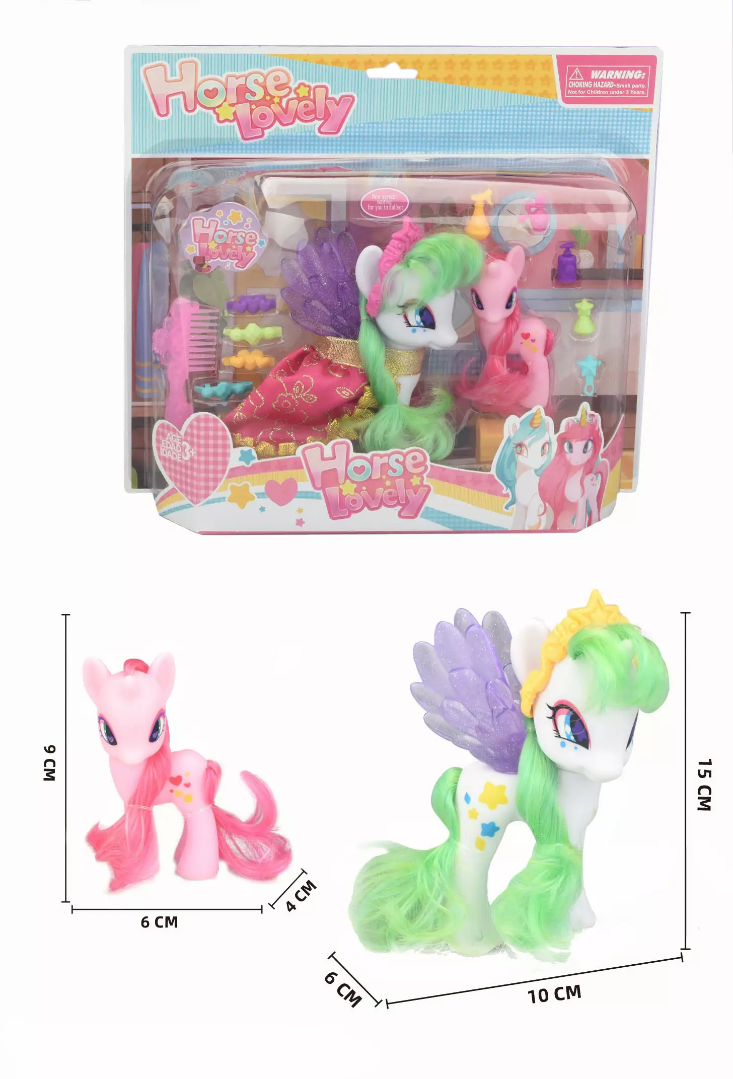 Setissä mukana olevat kampaus- ja koristevälineet innostavat luovaan leikkiin ja ponien stailaukseen. Pienempi poni on noin 9 cm korkea, ja isompi upeasiivekäs poni noin 15 cm korkea.