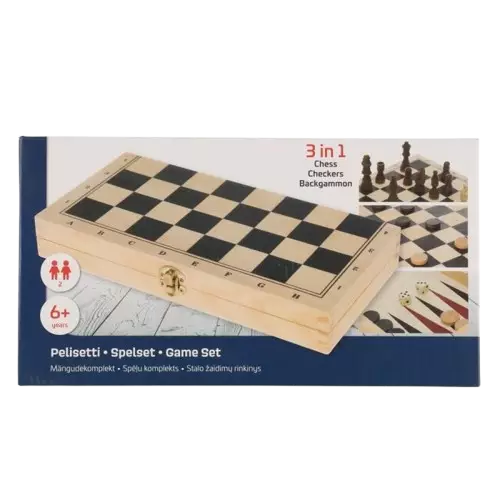 Shakki + 2 peliä Klassinen puinen pelisetti sisältää kolme pelien kuningasta: shakki, tammi ja backgammon. Sisältää peliohjeet. Ikäsuositus 6+.