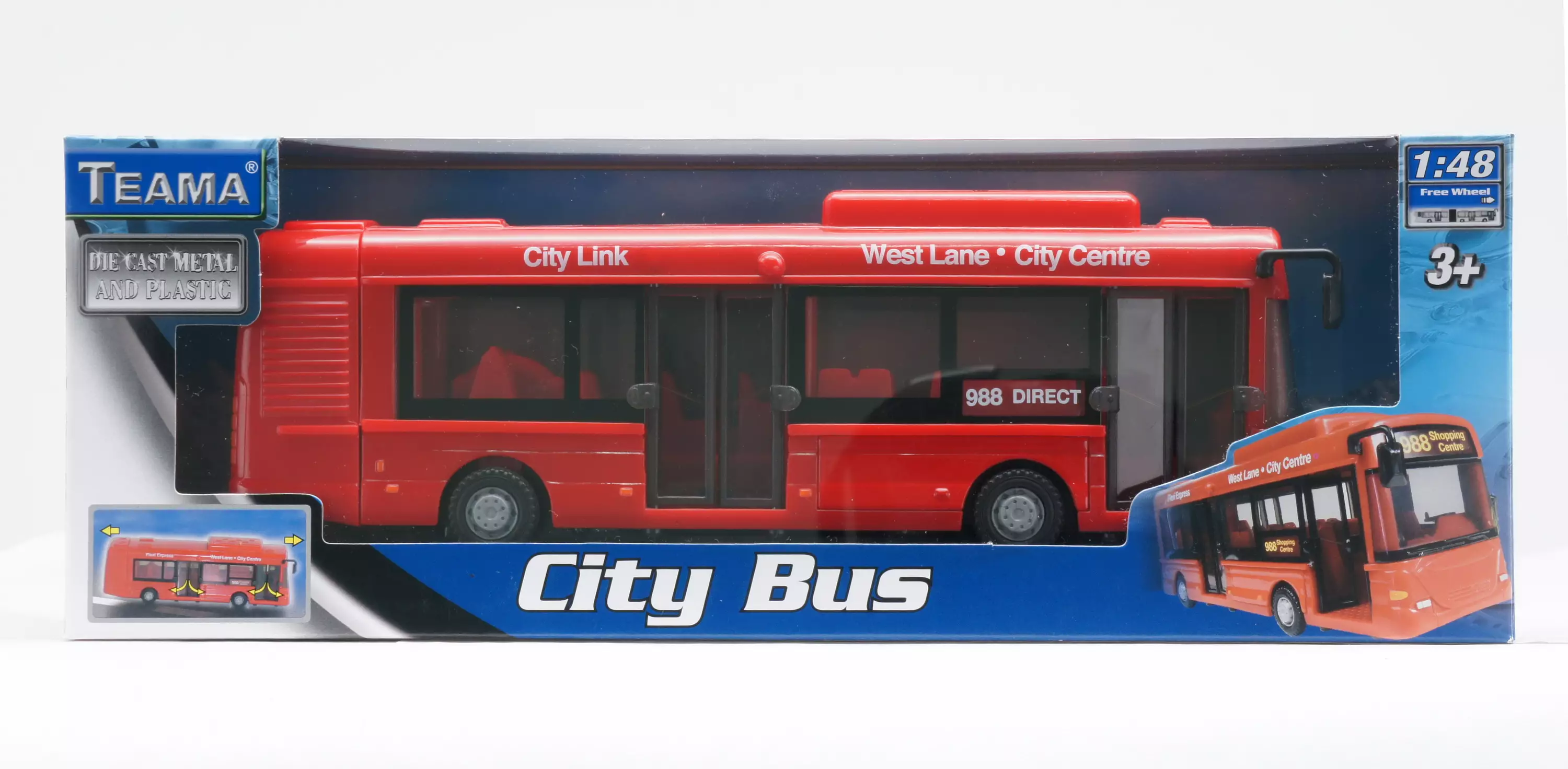 Autoleikkien peruskalustoa - kaupunkibussi. Avautuvat etu- ja sivuovet. Bussin pituus 22 cm. Mittasuhde 1:48. Lajitelmassa kolmea väriä. Ikäsuositus 3+ vuotta._x000D_