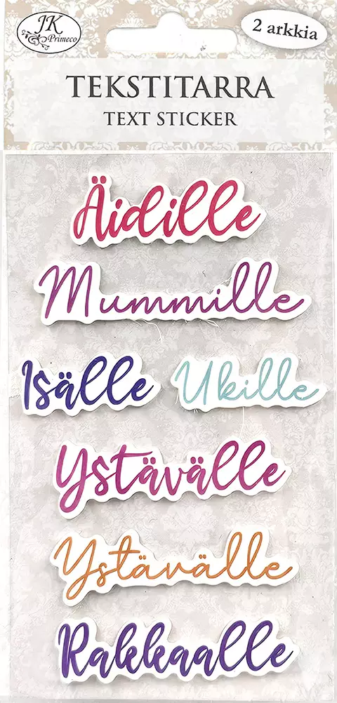 Ihanat pastellisävyiset tekstitarrat tuovat lämpöä ja persoonallisuutta kortteihin, lahjoihin ja askarteluun. Tarrat sisältävät valmiita tekstejä läheisille – täydellinen valinta, kun haluat ilahduttaa äitiä, isää, ystävää tai muuta tärkeää ihmistä.