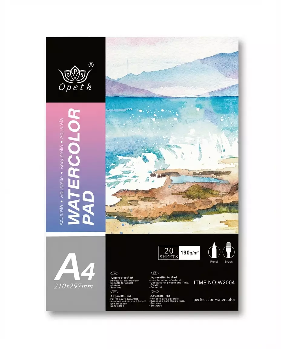 Laadukas A4-kokoinen vesivärilehtiö sopii erinomaisesti vesivärimaalaukseen, harjoitteluun ja luoviin projekteihin. 190 g/m² paperi kestää hyvin kosteutta ja värejä, mahdollistaen tasaisen värien levittymisen ilman liiallista aaltoilua.